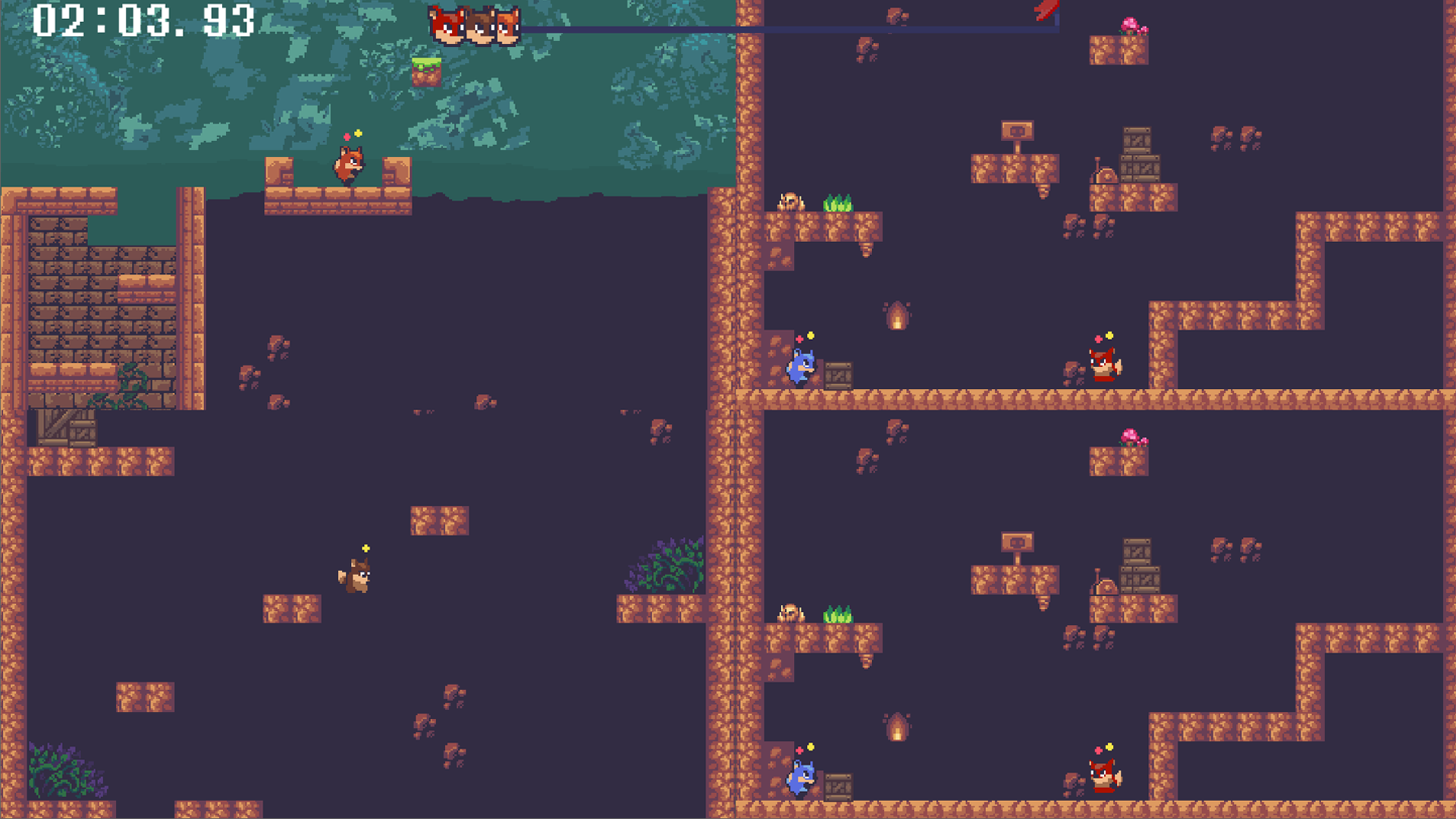 This game is heavily inspired by Jumpking (duh, it's in the name), but you always run (x2 duh, it's in the name) and have only control over dashes and jump (x3). Game supports local splitscreen up to 4 people and local multiplayer up to 9, P2P hosting is also an option, so it's sorta supports regular multiplayer as well. I do plan to add proper multiplayer, but probably after release which is currently planned at 12th of January, might change though, but still will be released in January.